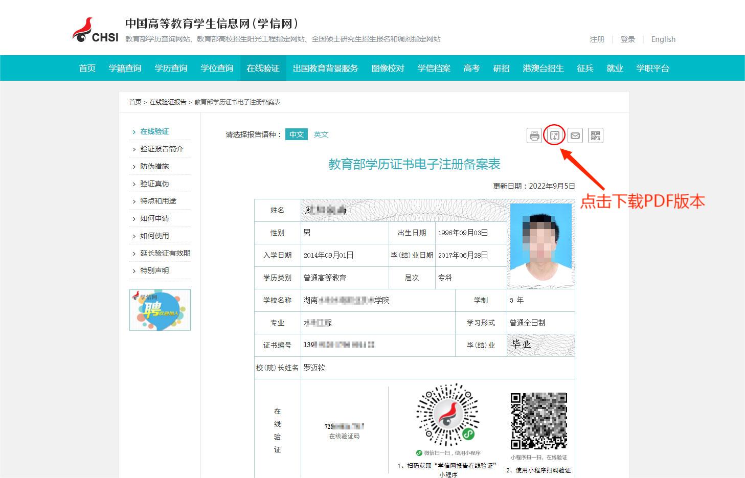 关于下载:点击《教育部学历证书电子注册备案表》右上角的下载标志,可以下载PDF版本的《教育部学历证书电子注册备案表》
